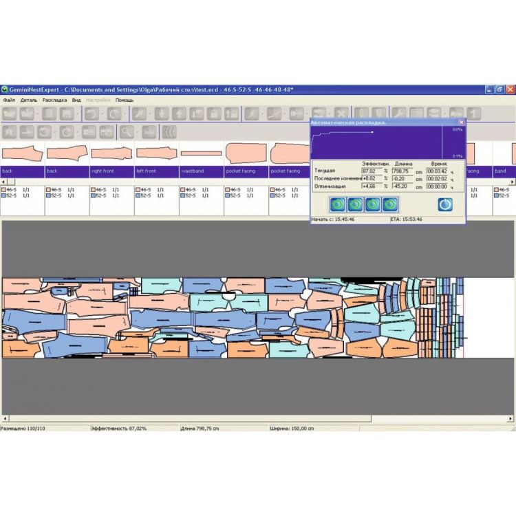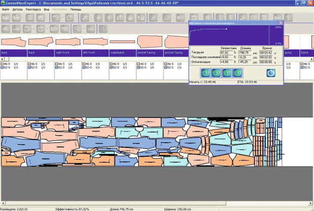 Gemini Nest Expert может выполнить полную автоматическую раскладку на стандартной ткани, ткани в сгиб и чулком, с клеткой, полоской, текстурой или без них, с особой шириной и усадкой, согласно со спецификацией каждой детали и свободе ее вращение.